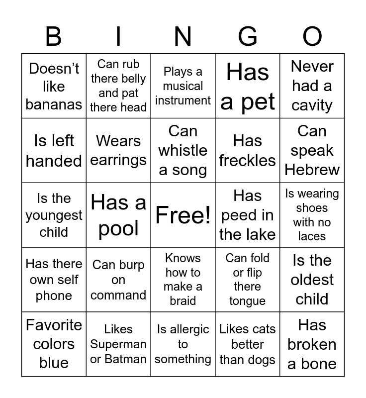This bingo card has a free space and 26 words: Has there own self phone, Likes Superman or Batman, Can whistle a song, Likes cats better than dogs, Never had a cavity, Doesn’t like bananas, Wears earrings, Plays a musical instrument, Has freckles, Has broken a bone, Is left handed, Has a pool, Afraid of spiders, Can fold or flip there tongue, Is wearing shoes with no laces, Can touch there tongue to there nose, Can rub there belly and pat there head, Knows how to make a braid, Has a pet, Is the oldest child, Is the youngest child, Can burp on command, Is allergic to something, Has peed in the lake, Can speak Hebrew and Favorite colors blue.