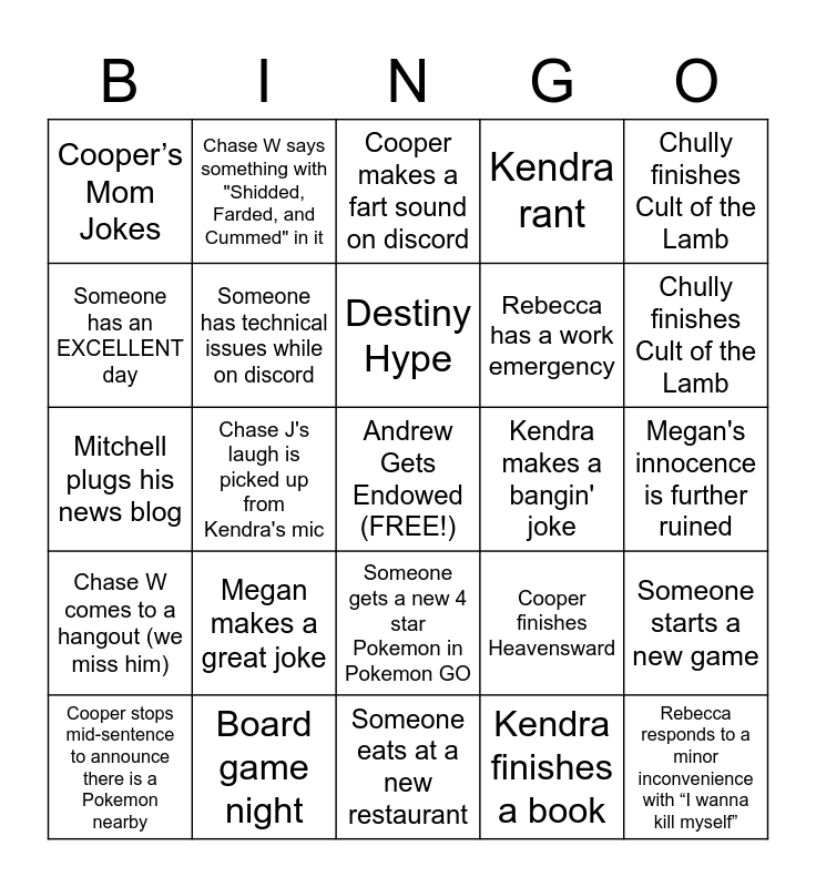 This bingo card has a free space and 24 words: Megan makes a great joke, Board game night, Destiny Hype, Cooper stops mid-sentence to announce there is a Pokemon nearby, Chully finishes Cult of the Lamb, Cooper’s Mom Jokes, Someone has an EXCELLENT day, Chase W says something with "Shidded, Farded, and Cummed" in it, Kendra makes a bangin' joke, Someone gets a new 4 star Pokemon in Pokemon GO, Rebecca has a work emergency, Mitchell plugs his news blog, Cooper finishes Heavensward, Someone starts a new game, Someone has technical issues while on discord, Kendra finishes a book, Megan's innocence is further ruined, Cooper makes a fart sound on discord, Chully finishes Cult of the Lamb, Chase J's laugh is picked up from Kendra's mic, Rebecca responds to a minor inconvenience with “I wanna kill myself”, Chase W comes to a hangout (we miss him), Kendra rant and Someone eats at a new restaurant.
