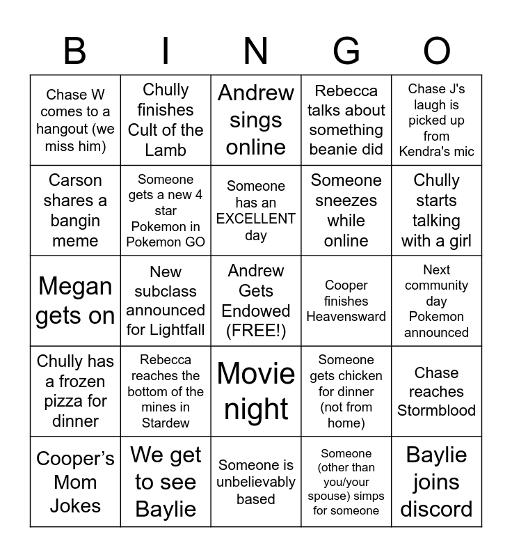 This bingo card has a free space and 24 words: Rebecca reaches the bottom of the mines in Stardew, We get to see Baylie, Someone has an EXCELLENT day, Cooper’s Mom Jokes, Chase J's laugh is picked up from Kendra's mic, Chase W comes to a hangout (we miss him), Carson shares a bangin meme, Chully finishes Cult of the Lamb, Cooper finishes Heavensward, Movie night, Someone sneezes while online, Megan gets on, Someone gets chicken for dinner (not from home), Chase reaches Stormblood, Someone gets a new 4 star Pokemon in Pokemon GO, Someone (other than you/your spouse) simps for someone, Next community day Pokemon announced, Andrew sings online, Chully starts talking with a girl, New subclass announced for Lightfall, Baylie joins discord, Chully has a frozen pizza for dinner, Rebecca talks about something beanie did and Someone is unbelievably based.