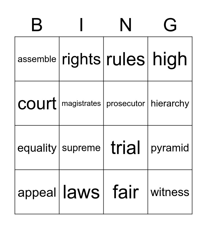 This bingo card has 16 words: laws, pyramid, rules, assemble, equality, rights, trial, fair, court, magistrates, appeal, high, supreme, hierarchy, prosecutor and witness.