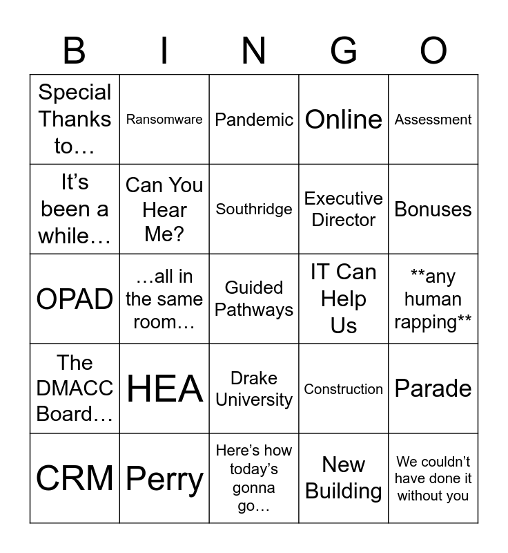 This bingo card has a free space and 105 words: Enrollment, Okay Folks, Assessment, Rubrics, Intentional Conversations, Breakout Sessions, Lunch, Listen Up, We’re Excited…, Please Welcome, 2020, Smiling Faces, 21st Century, World Domination, Trepidation, A New Semester, Pandemic, COVID-19, Student-Centered, Advising, If you know any legislators…, Reach out to those students…, It’s becoming a theme…, Ankeny Campus Geese, The new Dean, HEA, Bonuses, Online, Virtual Learning, Non-Traditional Students, Construction, New Building, Carroll, Newton, Urban, West Campus, Hunziker Center, Templeton, Southridge, Perry, The DMACC FOundation, The DMACC Board…, Welcome Back, It’s been a while…, National Champions, Special Thanks to…, Big Shout Out to…, We couldn’t have done it without you, A Special Place, Central Iowa, Lowest Tuition, Cost per Credit Hour, Cybersecurity, Reach out to your Supervisor, A New Era, Numbers, Diversity, Equity, and Inclusion, …been doing a great job…, High Level Initiatives, Drake University, **any human rapping**, Best in the State, Workplace, Number One, 2020, Concurrent Enrollment, Derecho, Ransomware, OPAD, …all in the same room…, Here’s how today’s gonna go…, Bingo!, …I don’t know if they’re here…, New Faculty stand up, Student Behavior, Undecided, Still Deciding, The data tells us…, CRM, Training, Academic Affairs, 5-year plan, You’re Muted, Can You Hear Me?, Is This Thing On?, IT Can Help Us, Broadcasting, We’re in every county…, Orientation, Afternoon Meetings, Be Back at…, FFA, Special Guest, Friday Email, Parade, Iowa State Fair, Governor, Signature Courses, Executive Director, Compared to last year…, Inflatable Bear, Retirement, Construction Projects, …I don’t know why this isn’t working… and Big Picture.