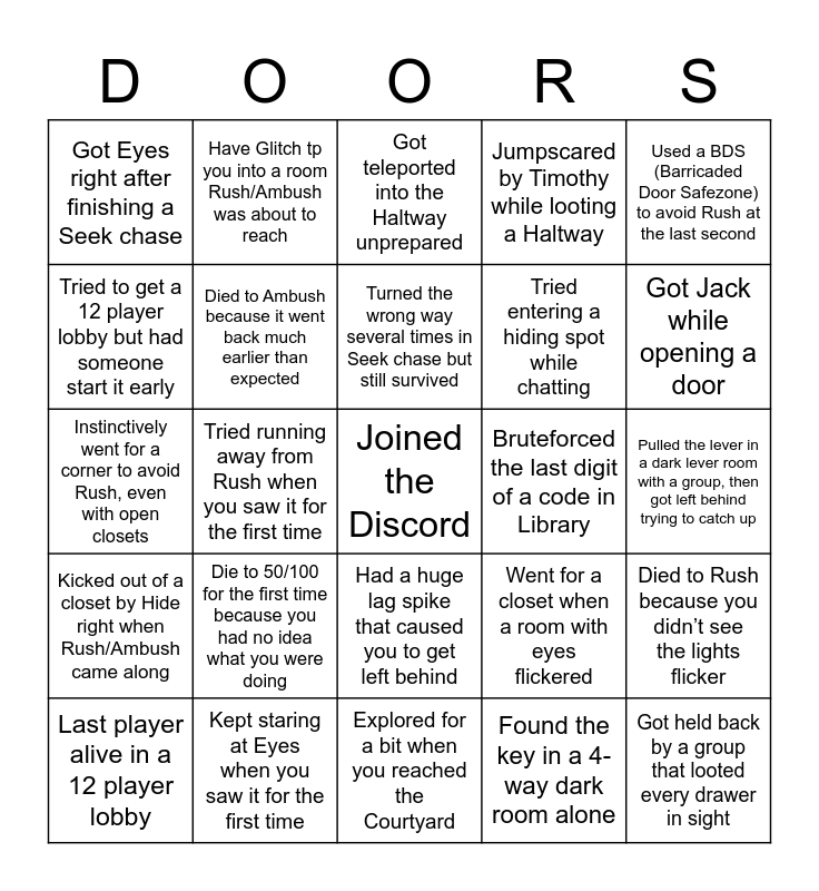 This bingo card has a free space and 24 words: Last player alive in a 12 player lobby, Die to 50/100 for the first time because you had no idea what you were doing, Turned the wrong way several times in Seek chase but still survived, Found the key in a 4-way dark room alone, Used a BDS (Barricaded Door Safezone) to avoid Rush at the last second, Got Eyes right after finishing a Seek chase, Have Glitch tp you into a room Rush/Ambush was about to reach, Got teleported into the Haltway unprepared, Bruteforced the last digit of a code in Library, Pulled the lever in a dark lever room with a group, then got left behind trying to catch up, Instinctively went for a corner to avoid Rush, even with open closets, Died to Ambush because it went back much earlier than expected, Went for a closet when a room with eyes flickered, Died to Rush because you didn’t see the lights flicker, Tried to get a 12 player lobby but had someone start it early, Kept staring at Eyes when you saw it for the first time, Explored for a bit when you reached the Courtyard, Jumpscared by Timothy while looting a Haltway, Got Jack while opening a door, Kicked out of a closet by Hide right when Rush/Ambush came along, Tried running away from Rush when you saw it for the first time, Had a huge lag spike that caused you to get left behind, Tried entering a hiding spot while chatting and Got held back by a group that looted every drawer in sight.