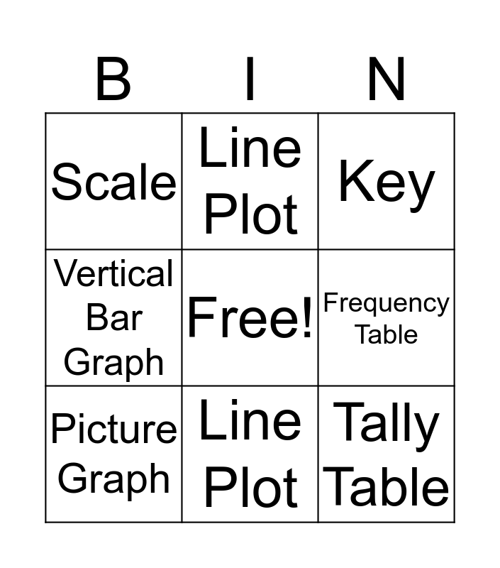 This bingo card has a free space and 8 words: Frequency Table, Key, Line Plot, Picture Graph, Scale, Tally Table, Vertical Bar Graph and Line Plot.