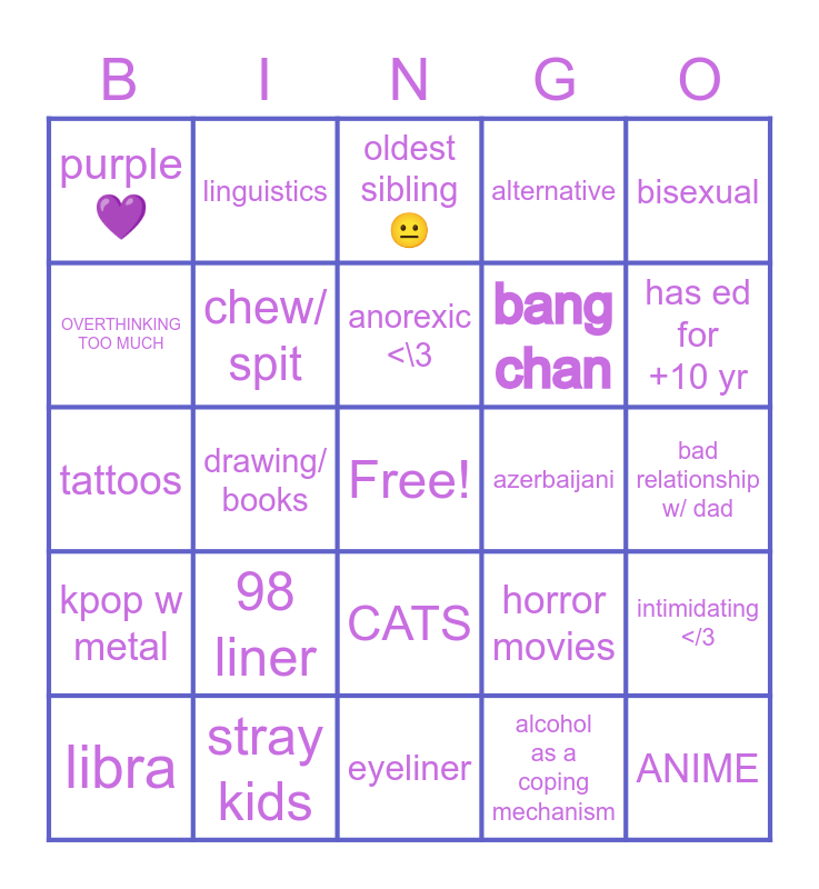 This bingo card has a free space and 24 words: 98 liner, stray kids, anorexic <\3, libra, bisexual, purple 💜, OVERTHINKING TOO MUCH, linguistics, azerbaijani, CATS, bang chan, tattoos, horror movies, intimidating </3, chew/ spit, alcohol as a coping mechanism, bad relationship w/ dad, oldest sibling😐, has ed for +10 yr, drawing/ books, ANIME, kpop w metal, alternative and eyeliner.