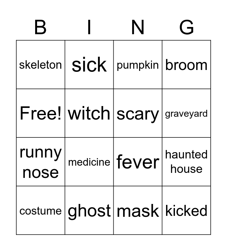 This bingo card has 16 words: ghost, haunted house, pumpkin, skeleton, runny nose, sick, fever, mask, Free!, witch, costume, broom, medicine, graveyard, scary and kicked.