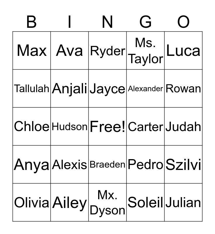 This bingo card has a free space and 24 words: Alexis, Ailey, Jayce, Olivia, Luca, Max, Tallulah, Ava, Carter, Braeden, Alexander, Chloe, Pedro, Szilvi, Anjali, Soleil, Judah, Ryder, Rowan, Hudson, Julian, Anya, Ms. Taylor and Mx. Dyson.