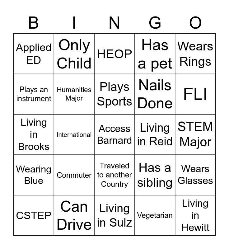 This bingo card has a free space and 24 words: CSTEP, Commuter, Plays Sports, Vegetarian, Wears Rings, Applied ED, Only Child, HEOP, Living in Reid, STEM Major, Living in Brooks, Humanities Major, Has a sibling, Wears Glasses, Plays an instrument, Can Drive, Living in Sulz, Has a pet, FLI, Wearing Blue, International, Traveled to another Country, Nails Done and Living in Hewitt.