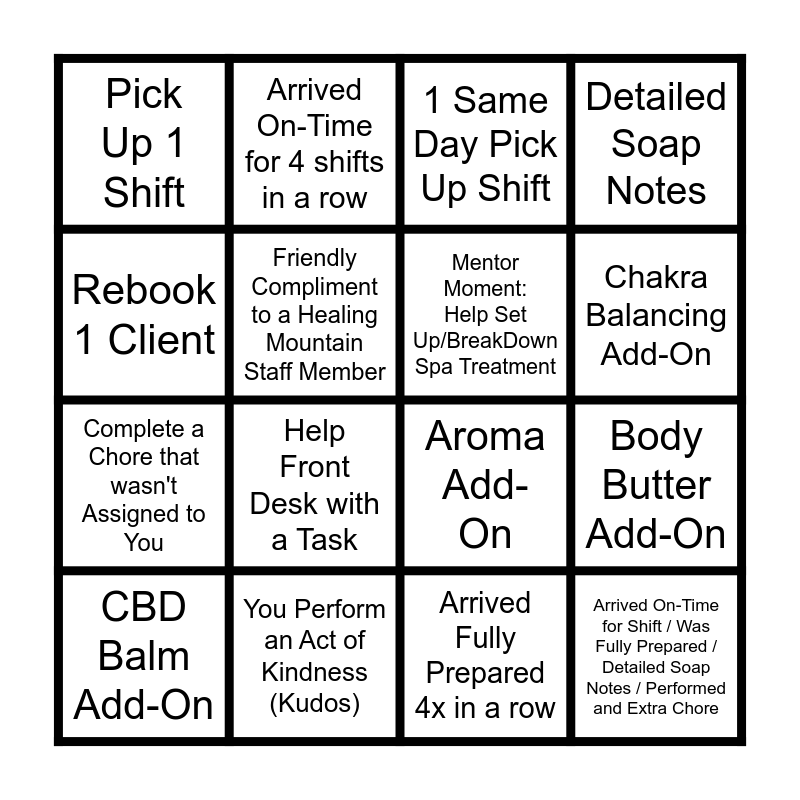 This bingo card has 16 words: CBD Balm Add-On, You Perform an Act of Kindness (Kudos), 1 Same Day Pick Up Shift, Detailed Soap Notes, Rebook 1 Client, Arrived On-Time for 4 shifts in a row, Aroma Add-On, Body Butter Add-On, Pick Up 1 Shift, Friendly Compliment to a Healing Mountain Staff Member, Arrived Fully Prepared 4x in a row, Chakra Balancing Add-On, Complete a Chore that wasn't Assigned to You, Help Front Desk with a Task, Mentor Moment: Help Set Up/BreakDown Spa Treatment and Arrived On-Time for Shift / Was Fully Prepared / Detailed Soap Notes / Performed and Extra Chore.