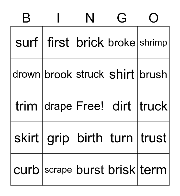 This bingo card has a free space and 28 words: trust, crown, shirt, brisk, drown, brick, first, skirt, dirt, curb, trim, broke, scrape, burst, brush, pride, grip, brook, struck, birth, surf, screen, term, drape, truck, turn, shrimp and trade.