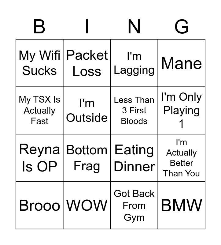 This bingo card has 16 words: WOW, I'm Actually Better Than You, I'm Lagging, My Wifi Sucks, Reyna Is OP, Packet Loss, Eating Dinner, Got Back From Gym, My TSX Is Actually Fast, I'm Outside, Brooo, Mane, Bottom Frag, I'm Only Playing 1, Less Than 3 First Bloods and BMW.