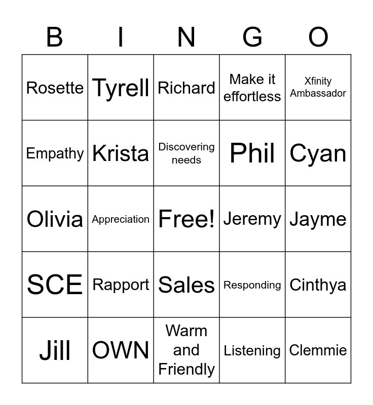 This bingo card has a free space and 24 words: Rapport, OWN, Discovering needs, Jill, Xfinity Ambassador, Rosette, Empathy, Tyrell, Jeremy, Sales, Phil, Olivia, Responding, Cinthya, Krista, Listening, Jayme, Richard, Cyan, Appreciation, Clemmie, SCE, Make it effortless and Warm and Friendly.