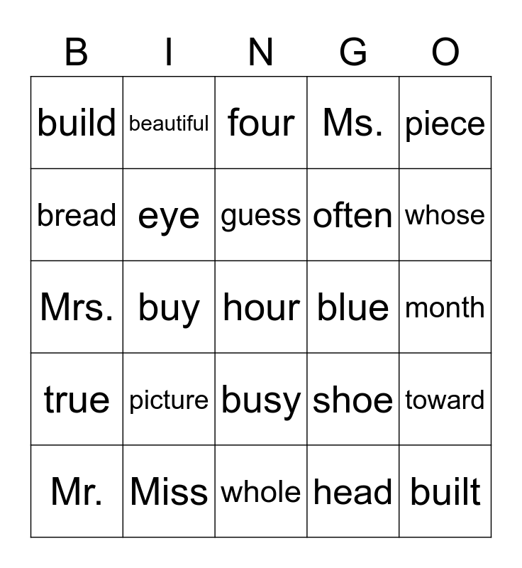 This bingo card has 28 words: toward, won, often, head, bread, four, beautiful, true, blue, Mr., Mrs., Ms., Miss, whole, whose, who's, picture, eye, guess, busy, build, built, hour, buy, month, shoe, piece and money.