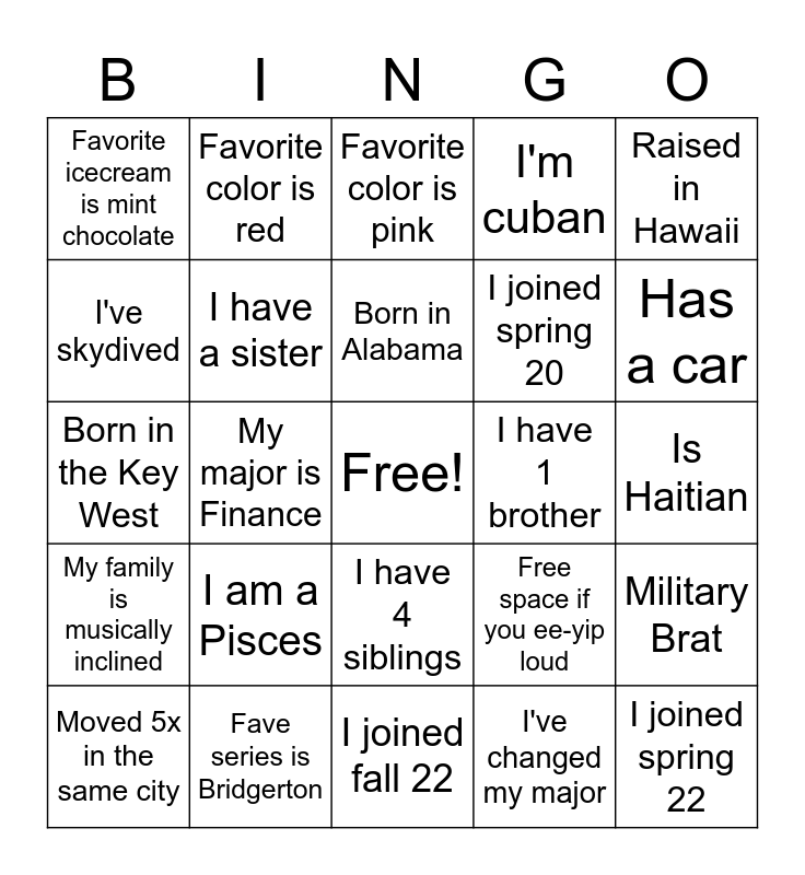 This bingo card has a free space and 25 words: I am a Pisces, I joined fall 22, Born in Alabama, Moved 5x in the same city, Raised in Hawaii, Favorite icecream is mint chocolate, I've skydived, Favorite color is red, I have 1 brother, I have 4 siblings, I joined spring 20, Born in the Key West, Free space if you ee-yip loud, Military Brat, I have a sister, Has a Disney character tattoo, Is Haitian, Favorite color is pink, Has a car, My major is Finance, I joined spring 22, Fave series is Bridgerton, My family is musically inclined, I'm cuban and I've changed my major.