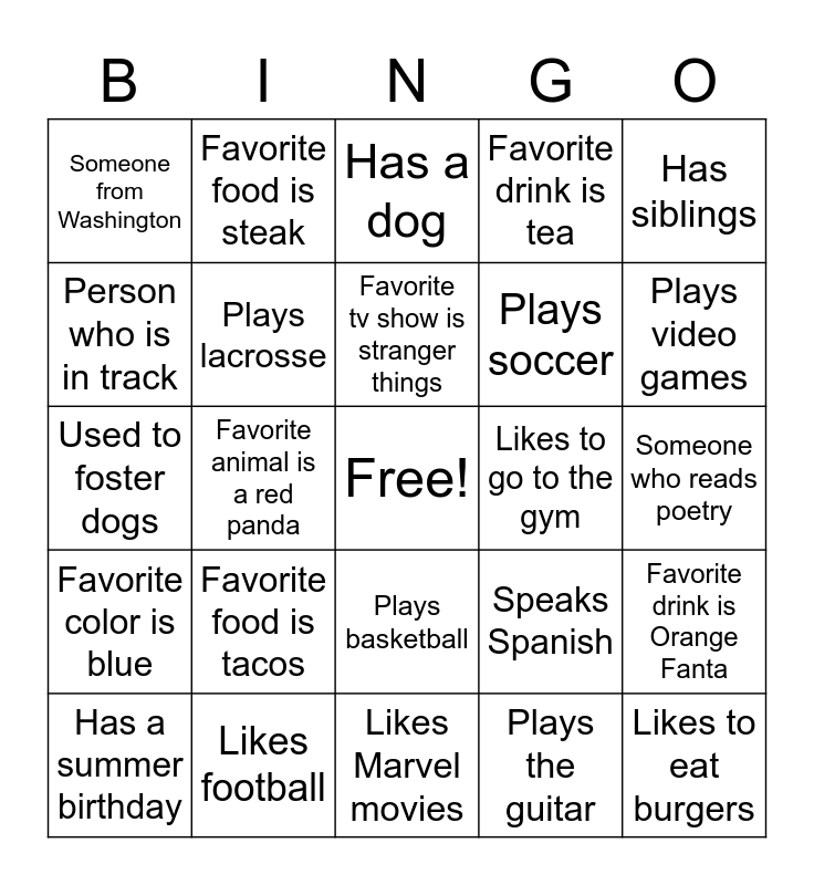 This bingo card has a free space and 24 words: Favorite food is tacos, Likes football, Favorite tv show is stranger things, Has a summer birthday, Has siblings, Someone from Washington, Person who is in track, Favorite food is steak, Likes to go to the gym, Plays basketball, Plays soccer, Used to foster dogs, Speaks Spanish, Favorite drink is Orange Fanta, Plays lacrosse, Plays the guitar, Someone who reads poetry, Has a dog, Plays video games, Favorite animal is a red panda, Likes to eat burgers, Favorite color is blue, Favorite drink is tea and Likes Marvel movies.