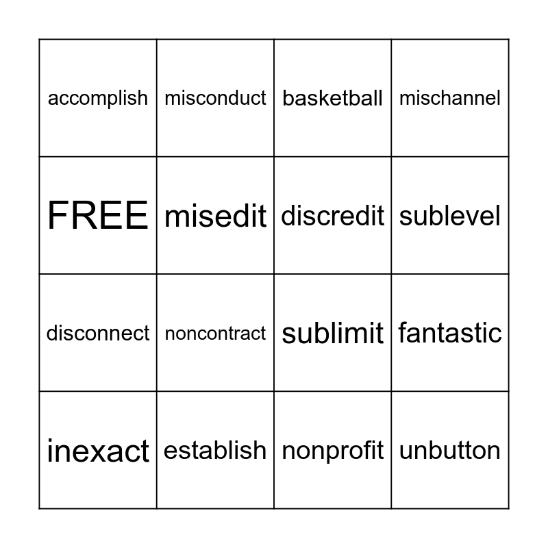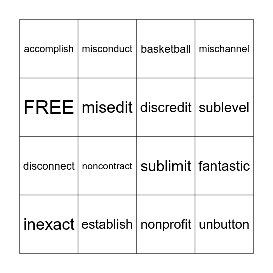 This bingo card has 16 words: establish, fantastic, basketball, accomplish, disconnect, misconduct, sublimit, nonprofit, FREE, misedit, inexact, mischannel, noncontract, sublevel, discredit and unbutton.