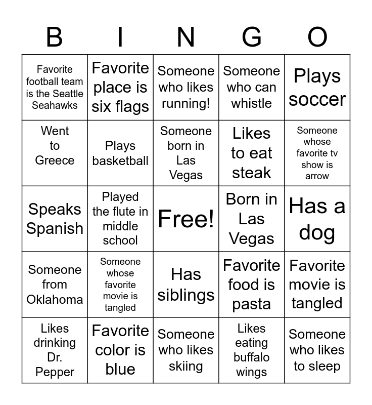 This bingo card has a free space and 24 words: Someone whose favorite movie is tangled, Favorite color is blue, Someone born in Las Vegas, Likes drinking Dr. Pepper, Plays soccer, Favorite football team is the Seattle Seahawks, Went to Greece, Favorite place is six flags, Born in Las Vegas, Has siblings, Likes to eat steak, Speaks Spanish, Favorite food is pasta, Favorite movie is tangled, Plays basketball, Likes eating buffalo wings, Has a dog, Someone who likes running!, Someone whose favorite tv show is arrow, Played the flute in middle school, Someone who likes to sleep, Someone from Oklahoma, Someone who can whistle and Someone who likes skiing.
