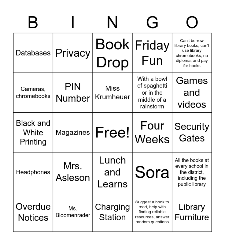 This bingo card has a free space and 24 words: Mrs. Asleson, Ms. Bloomenrader, Miss Krumheuer, Overdue Notices, Can't borrow library books, can't use library chromebooks, no diploma, and pay for books, Databases, Cameras, chromebooks, Privacy, Four Weeks, Lunch and Learns, With a bowl of spaghetti or in the middle of a rainstorm, Black and White Printing, Sora, All the books at every school in the district, including the public library, PIN Number, Suggest a book to read, help with finding reliable resources, answer random questions, Security Gates, Book Drop, Games and videos, Magazines, Library Furniture, Headphones, Friday Fun and Charging Station.