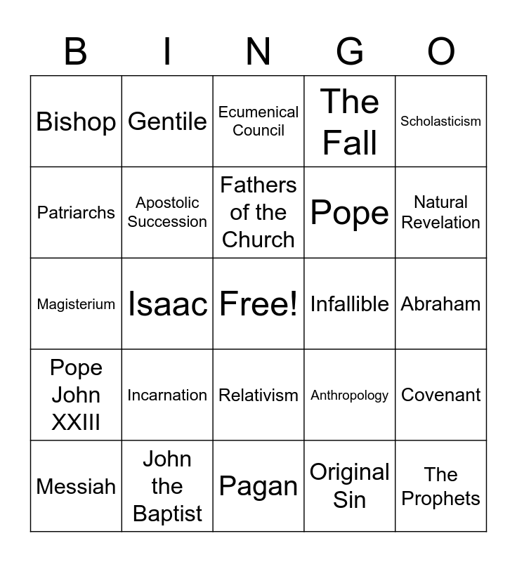 This bingo card has a free space and 25 words: Incarnation, Pagan, Fathers of the Church, Messiah, Scholasticism, Bishop, Patriarchs, Gentile, Infallible, Relativism, Pope, Magisterium, Anthropology, Covenant, Apostolic Succession, Deposit of Faith, Abraham, Ecumenical Council, Natural Revelation, Isaac, The Prophets, John the Baptist, Pope John XXIII, The Fall and Original Sin.