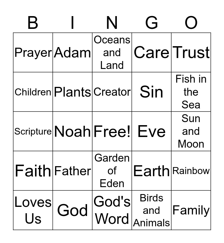 This bingo card has a free space and 24 words: Father, God, Creator, Loves Us, Trust, Prayer, Children, Adam, Eve, Garden of Eden, Sin, Scripture, Earth, Rainbow, Plants, Birds and Animals, Sun and Moon, Oceans and Land, Fish in the Sea, Noah, Family, Faith, Care and God's Word.