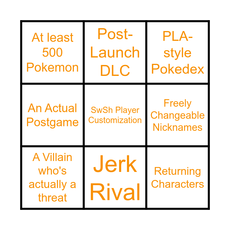 This bingo card has a free space and 8 words: Freely Changeable Nicknames, PLA-style Pokedex, Post-Launch DLC, A Villain who's actually a threat, At least 500 Pokemon, Returning Characters, An Actual Postgame and Jerk Rival.
