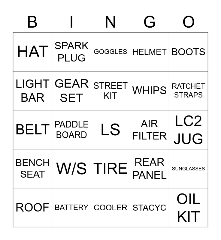 This bingo card has a free space and 24 words: W/S, BATTERY, STREET KIT, ROOF, BOOTS, HAT, LIGHT BAR, SPARK PLUG, AIR FILTER, TIRE, WHIPS, BELT, REAR PANEL, SUNGLASSES, GEAR SET, STACYC, LC2 JUG, GOGGLES, RATCHET STRAPS, PADDLE BOARD, OIL KIT, BENCH SEAT, HELMET and COOLER.