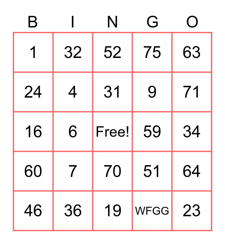 This bingo card has a free space and 25 words: 7, 19, 31, 46, 63, 1, 24, 32, 59, 70, 9, 16, 51, 64, 4, 29, 34, 52, 71, 6, 23, 36, 60, 75 and WFGG.