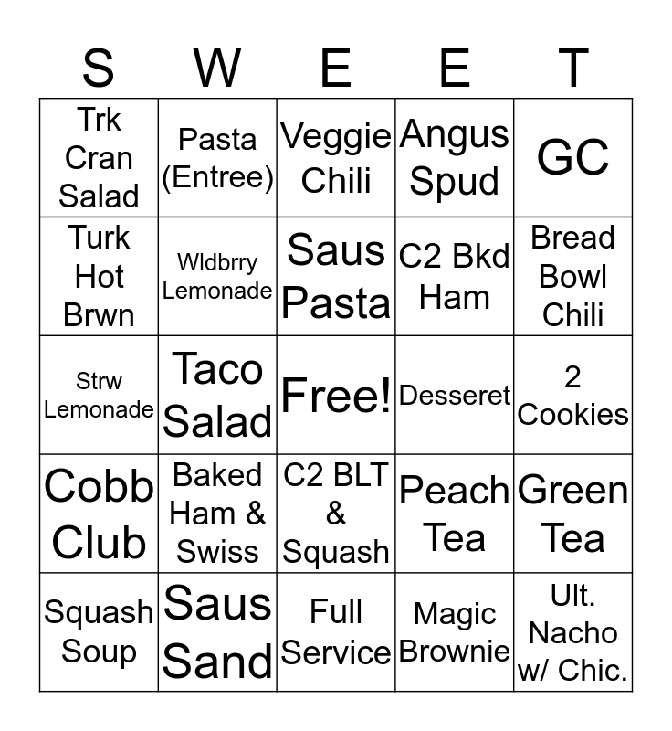 This bingo card has a free space and 24 words: Baked Ham & Swiss, Saus Sand, Saus Pasta, Squash Soup, GC, Trk Cran Salad, Turk Hot Brwn, Pasta (Entree), Desseret, C2 BLT & Squash, C2 Bkd Ham, Strw Lemonade, Peach Tea, Green Tea, Wldbrry Lemonade, Magic Brownie, 2 Cookies, Veggie Chili, Bread Bowl Chili, Taco Salad, Ult. Nacho w/ Chic., Cobb Club, Angus Spud and Full Service.
