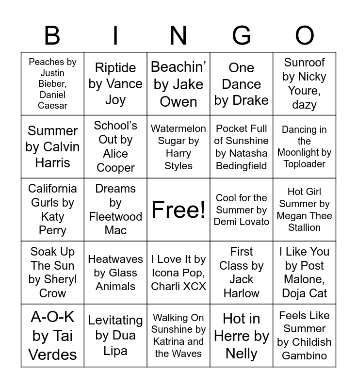This bingo card has a free space and 24 words: Heatwaves by Glass Animals, Levitating by Dua Lipa, Watermelon Sugar by Harry Styles, A-O-K by Tai Verdes, Sunroof by Nicky Youre, dazy, Peaches by Justin Bieber, Daniel Caesar, Summer by Calvin Harris, Riptide by Vance Joy, Cool for the Summer by Demi Lovato, I Love It by Icona Pop, Charli XCX, Pocket Full of Sunshine by Natasha Bedingfield, California Gurls by Katy Perry, First Class by Jack Harlow, I Like You by Post Malone, Doja Cat, School’s Out by Alice Cooper, Hot in Herre by Nelly, Hot Girl Summer by Megan Thee Stallion, Beachin’ by Jake Owen, Dancing in the Moonlight by Toploader, Dreams by Fleetwood Mac, Feels Like Summer by Childish Gambino, Soak Up The Sun by Sheryl Crow, One Dance by Drake and Walking On Sunshine by Katrina and the Waves.