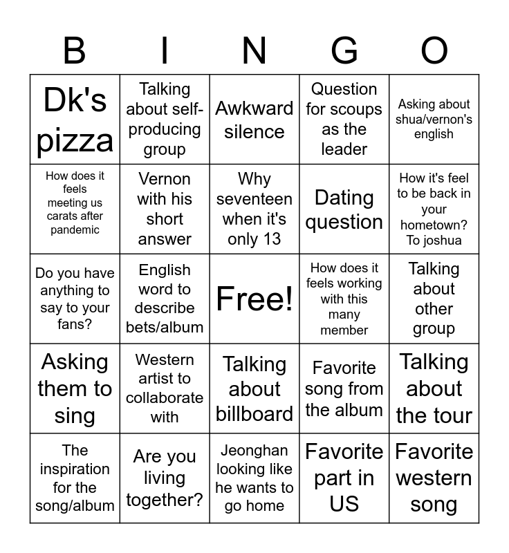This bingo card has a free space and 24 words: Western artist to collaborate with, Are you living together?, Why seventeen when it's only 13, The inspiration for the song/album, Asking about shua/vernon's english, Dk's pizza, How does it feels meeting us carats after pandemic, Talking about self-producing group, How does it feels working with this many member, Talking about billboard, Dating question, Do you have anything to say to your fans?, Favorite song from the album, Talking about the tour, Vernon with his short answer, Favorite part in US, Talking about other group, Awkward silence, How it's feel to be back in your hometown? To joshua, English word to describe bets/album, Favorite western song, Asking them to sing, Question for scoups as the leader and Jeonghan looking like he wants to go home.