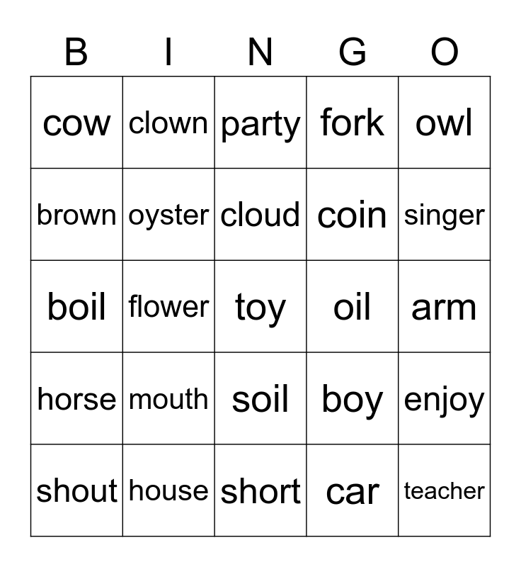 This bingo card has a free space and 24 words: mouth, house, cloud, shout, owl, cow, brown, clown, oil, soil, coin, boil, boy, enjoy, oyster, car, arm, party, singer, flower, teacher, horse, fork and short.