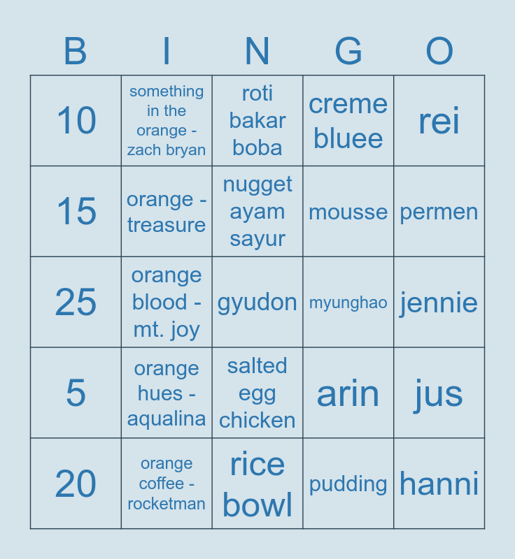 This bingo card has 25 words: 5, orange coffee - rocketman, gyudon, pudding, rei, 10, something in the orange - zach bryan, roti bakar boba, myunghao, jus, 15, orange - treasure, rice bowl, arin, permen, 20, orange blood - mt. joy, nugget ayam sayur, mousse, jennie, 25, orange hues - aqualina, salted egg chicken, creme bluee and hanni.