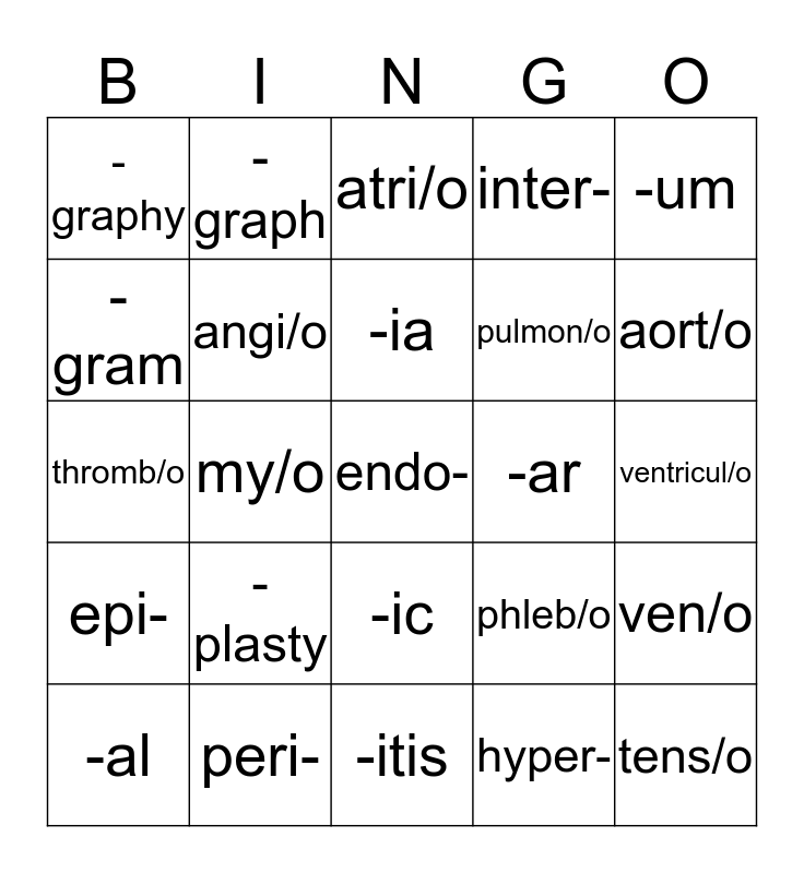 This bingo card has 25 words: -plasty, -itis, -ia, -al, -um, -graphy, -gram, -graph, -ar, -ic, pulmon/o, thromb/o, phleb/o, ven/o, angi/o, tens/o, ventricul/o, atri/o, aort/o, my/o, endo-, peri-, epi-, inter- and hyper-.