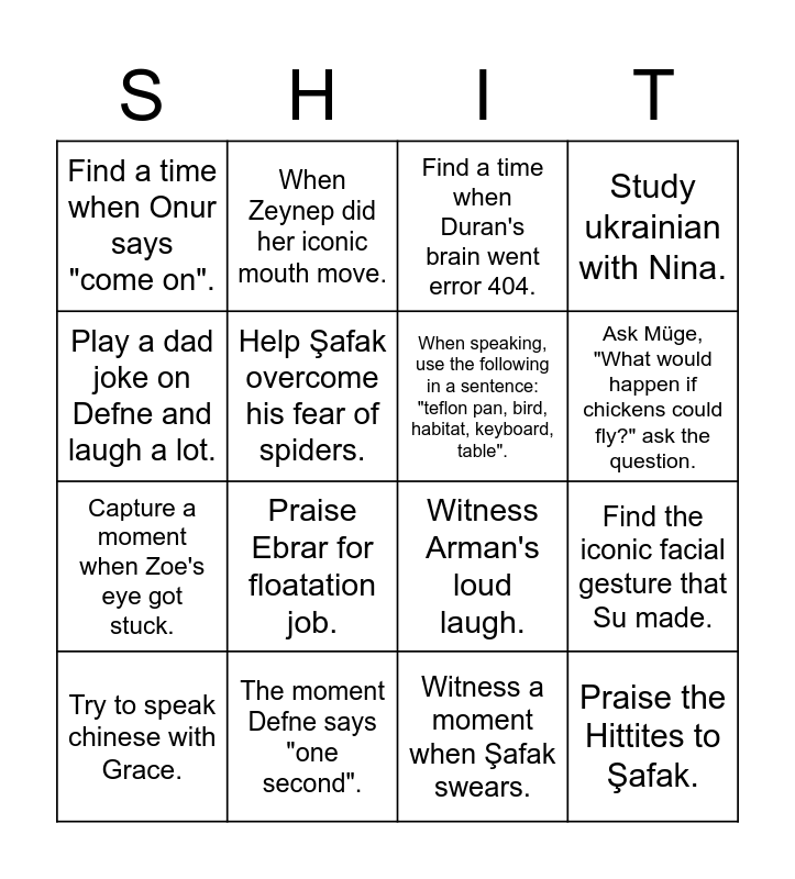 This bingo card has 16 words: The moment Defne says "one second"., Find the iconic facial gesture that Su made., Find a time when Duran's brain went error 404., Find a time when Onur says "come on"., Capture a moment when Zoe's eye got stuck., When Zeynep did her iconic mouth move., Witness Arman's loud laugh., Witness a moment when Şafak swears., Play a dad joke on Defne and laugh a lot., Help Şafak overcome his fear of spiders., Try to speak chinese with Grace., Study ukrainian with Nina., Praise Ebrar for floatation job., Ask Müge, "What would happen if chickens could fly?" ask the question., When speaking, use the following in a sentence: "teflon pan, bird, habitat, keyboard, table". and Praise the Hittites to Şafak..