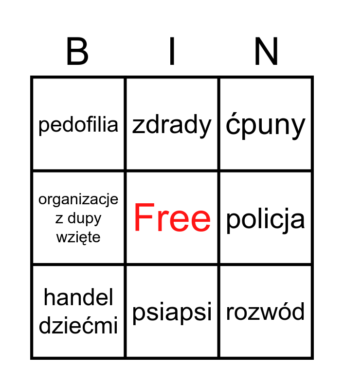 This bingo card has a free space and 8 words: policja, ćpuny, zdrady, handel dziećmi, pedofilia, rozwód, organizacje z dupy wzięte and psiapsi.