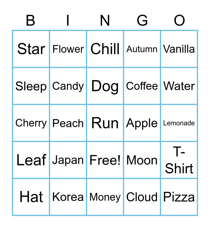 This bingo card has 26 words: Free!, Cloud, Dog, Korea, Vanilla, Star, Sleep, Flower, Lemonade, Moon, Coffee, Cherry, T-Shirt, Hat, Peach, Cake, Autumn, Leaf, Chill, Run, Water, Money, Apple, Japan, Candy and Pizza.