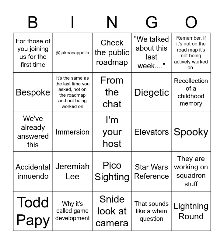 This bingo card has a free space and 24 words: Jeremiah Lee, Why it's called game development, From the chat, Todd Papy, Remember, if it's not on the road map it's not being actively worked on., For those of you joining us for the first time, Bespoke, @jakeacappella, Elevators, Pico Sighting, Diegetic, We've already answered this, Star Wars Reference, They are working on squadron stuff, It's the same as the last time you asked, not on the roadmap and not being worked on, That sounds like a when question, Spooky, Check the public roadmap, Recollection of a childhood memory, Immersion, Lightning Round, Accidental innuendo, "We talked about this last week...." and Snide look at camera.