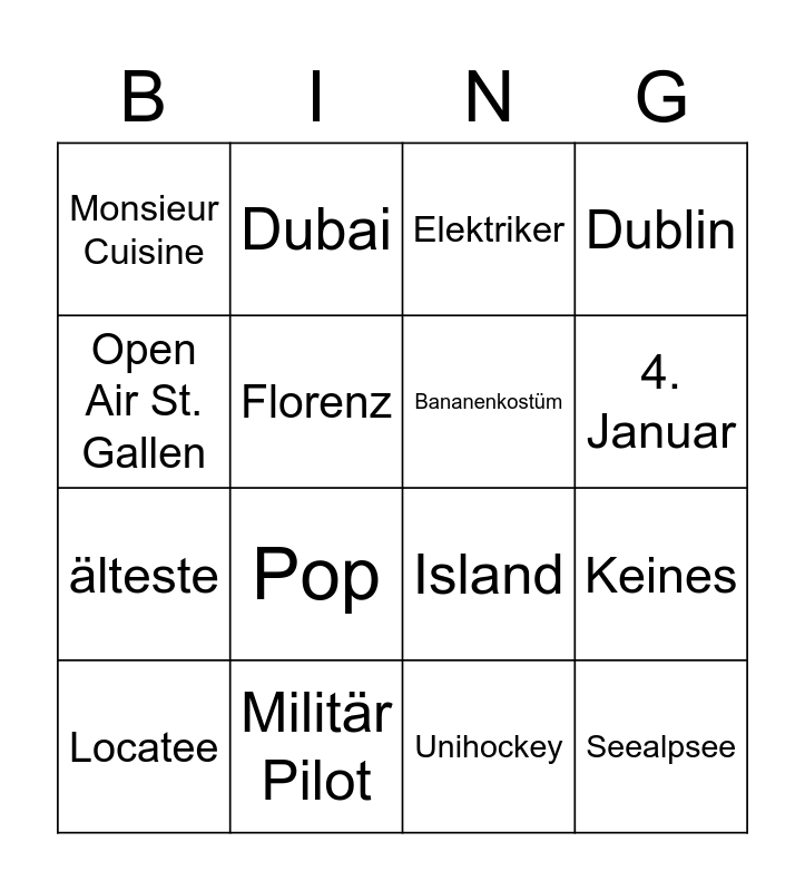 This bingo card has 25 words: Elisabeth, Fabienne, 4. Januar, Blockflöte, Open Air St. Gallen, Monsieur Cuisine, Florenz, Dubai, Militär Pilot, 12. August, älteste, Island, Wassermelone, Lustiges Taschenbuch, Bananenkostüm, Burrata Spaghetti, Unihockey, Elektriker, Pop, Keines, Locatee, 48, Seealpsee, Dublin and Mutschellenstrasse 52.