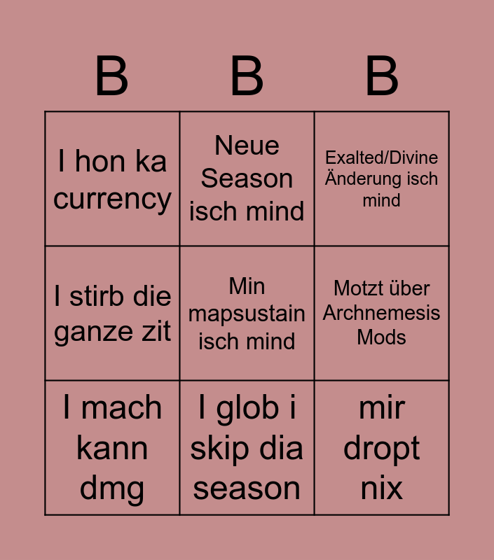 This bingo card has a free space and 8 words: Motzt über Archnemesis Mods, Exalted/Divine Änderung isch mind, Neue Season isch mind, I mach kann dmg, I hon ka currency, mir dropt nix, I stirb die ganze zit and I glob i skip dia season.