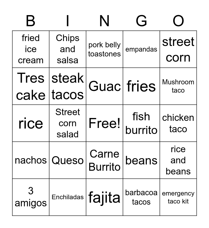 This bingo card has a free space and 24 words: Queso, Enchiladas, Guac, 3 amigos, street corn, fried ice cream, Tres cake, Chips and salsa, fish burrito, Carne Burrito, fries, rice, beans, rice and beans, steak tacos, barbacoa tacos, chicken taco, pork belly toastones, Mushroom taco, Street corn salad, emergency taco kit, nachos, empandas and fajita.