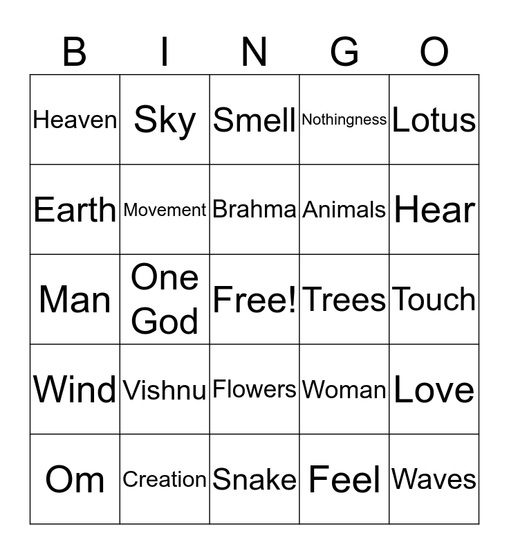 This bingo card has a free space and 24 words: Vishnu, Creation, Brahma, Om, Lotus, Heaven, Earth, Sky, Trees, Flowers, Animals, Man, Woman, Love, Movement, Feel, Touch, Smell, Hear, One God, Waves, Wind, Nothingness and Snake.