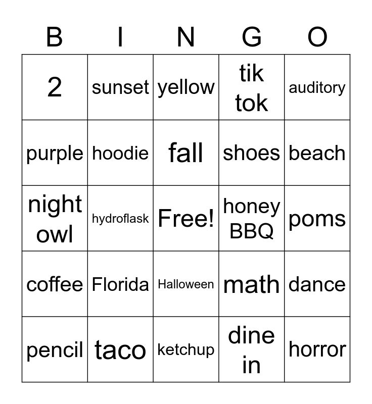 This bingo card has a free space and 24 words: Florida, taco, fall, pencil, auditory, 2, purple, sunset, honey BBQ, Halloween, shoes, night owl, math, dance, hoodie, dine in, poms, yellow, beach, hydroflask, horror, coffee, tik tok and ketchup.