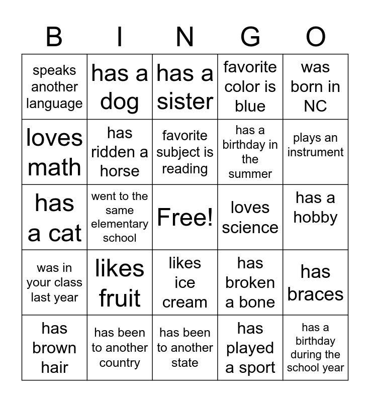 This bingo card has a free space and 24 words: has brown hair, likes fruit, favorite subject is reading, has played a sport, was born in NC, speaks another language, has a dog, has a sister, loves science, has a hobby, has a cat, has ridden a horse, has broken a bone, has braces, loves math, has been to another country, has been to another state, favorite color is blue, plays an instrument, was in your class last year, went to the same elementary school, likes ice cream, has a birthday in the summer and has a birthday during the school year.