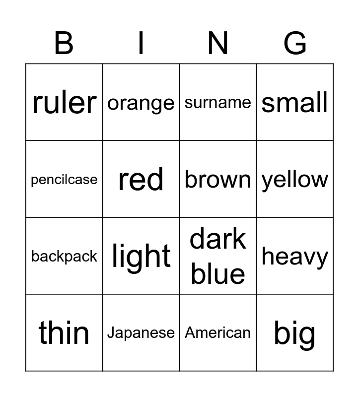 This bingo card has 25 words: Free!, green, yellow, pencil, pencilcase, ruler, red, orange, Japanese, eraser, backpack, dark blue, gray, purple, brown, black, American, surname, light, heavy, thin, thick, big, small and white.