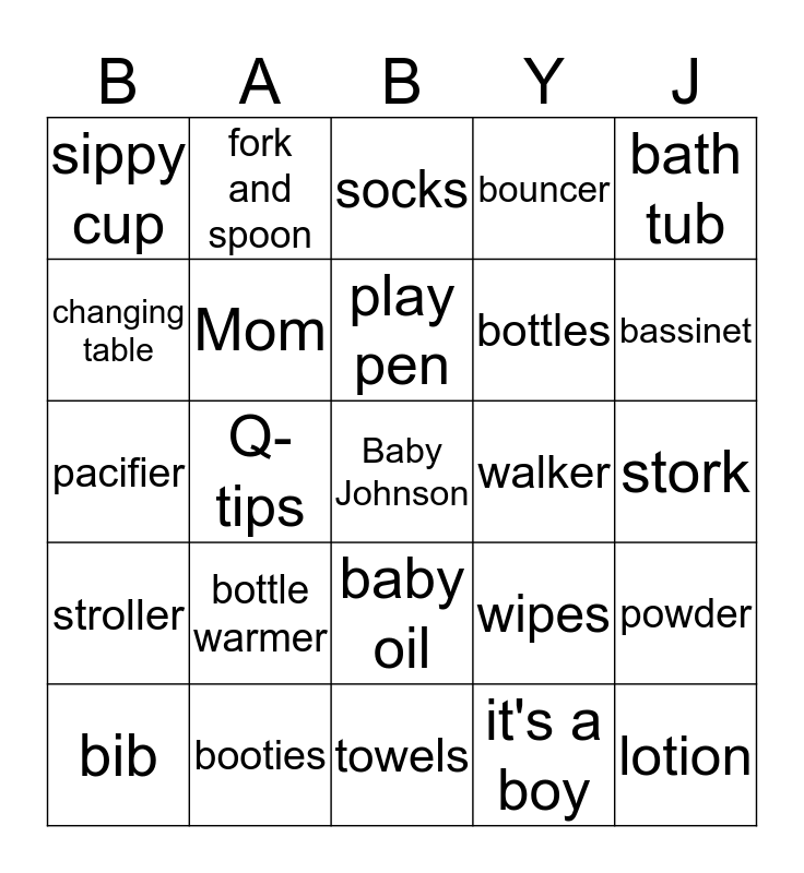 This bingo card has a free space and 24 words: bottle warmer, booties, play pen, bib, bath tub, sippy cup, changing table, fork and spoon, walker, baby oil, bottles, pacifier, wipes, powder, Mom, it's a boy, stork, socks, bassinet, Q-tips, lotion, stroller, bouncer and towels.