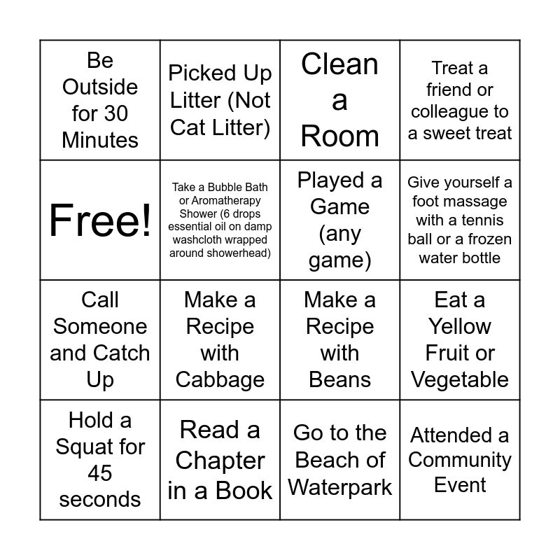 This bingo card has 16 words: Read a Chapter in a Book, Eat a Yellow Fruit or Vegetable, Clean a Room, Be Outside for 30 Minutes, Call Someone and Catch Up, Picked Up Litter (Not Cat Litter), Make a Recipe with Beans, Go to the Beach of Waterpark, Free!, Take a Bubble Bath or Aromatherapy Shower (6 drops essential oil on damp washcloth wrapped around showerhead), Hold a Squat for 45 seconds, Treat a friend or colleague to a sweet treat, Make a Recipe with Cabbage, Give yourself a foot massage with a tennis ball or a frozen water bottle, Played a Game (any game) and Attended a Community Event.