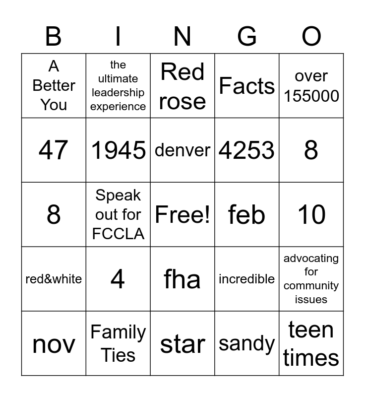 This bingo card has a free space and 30 words: Family Ties, Take the Lead, Speak out for FCCLA, Working on Working, A Better You, Red rose, 1945, fha, feb, star, 10, teen times, sandy, reston, 8, toward new horizon, incredible, red&white, 4, over 155000, 8, focus on family, the ultimate leadership experience, 4253, 47, Facts, advocating for community issues, nov, denver and over 30.