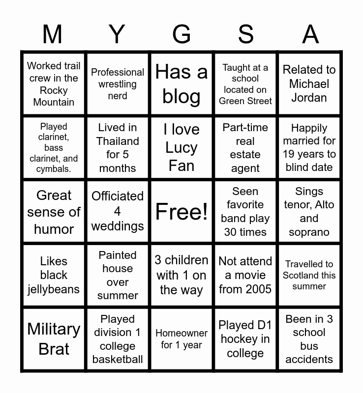This bingo card has a free space and 24 words: Painted house over summer, Played division 1 college basketball, I love Lucy Fan, Military Brat, Related to Michael Jordan, Worked trail crew in the Rocky Mountain, Played clarinet, bass clarinet, and cymbals., Professional wrestling nerd, Seen favorite band play 30 times, 3 children with 1 on the way, Part-time real estate agent, Great sense of humor, Not attend a movie from 2005, Travelled to Scotland this summer, Lived in Thailand for 5 months, Played D1 hockey in college, Sings tenor, Alto and soprano, Has a blog, Happily married for 19 years to blind date, Officiated 4 weddings, Been in 3 school bus accidents, Likes black jellybeans, Taught at a school located on Green Street and Homeowner for 1 year.