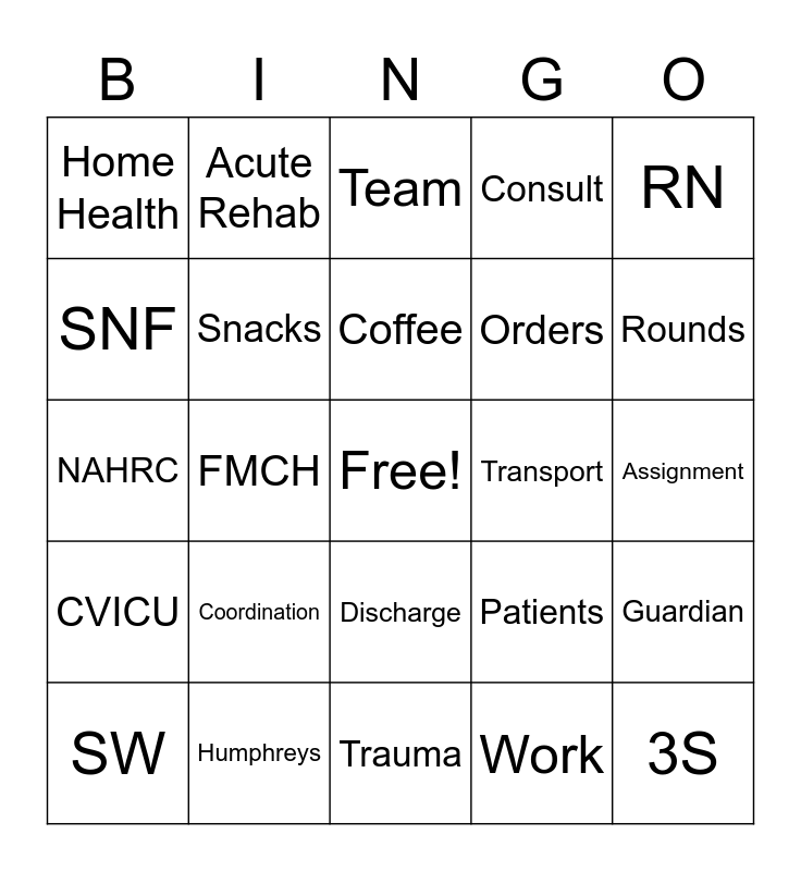 This bingo card has a free space and 25 words: Coordination, Trauma, Coffee, SW, RN, Home Health, SNF, Acute Rehab, Transport, Discharge, Orders, NAHRC, Patients, Guardian, Snacks, Infusions, Assignment, Team, Rounds, FMCH, 3S, Humphreys, CVICU, Consult and Work.
