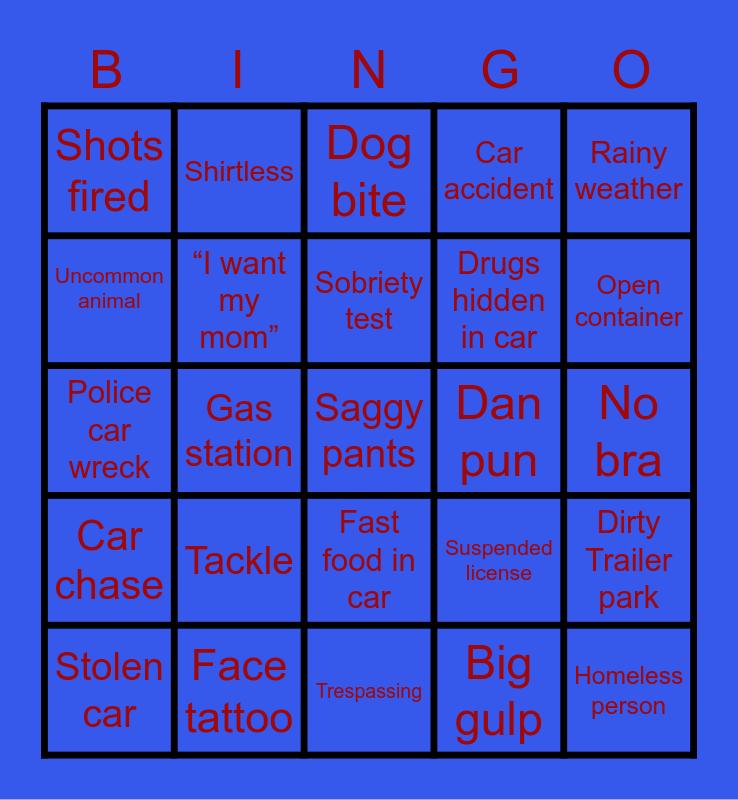 This bingo card has 40 words: American flag, Police car wreck, Warrant, “I want my mom”, Face tattoo, Fast food in car, Sobriety test, Air freshener, Rainy weather, Car chase, Gas station, Car accident, Saggy pants, No bra, Dan pun, Tackle, “I see lights flashing”, Shots fired, Taser deployed, Dog bite, Dirty Trailer park, Big gulp, Drugs hidden in car, Uncommon animal, No shoes, No bike light, Cowboy boots/hat, Singing, Homeless person, Pursuit terminated, Stop sticks, Stolen car, Guns drawn, Suspended license, Open container, Trespassing, Domestic w/injuries, Put maneuver, Shirtless and Foot pursuit.