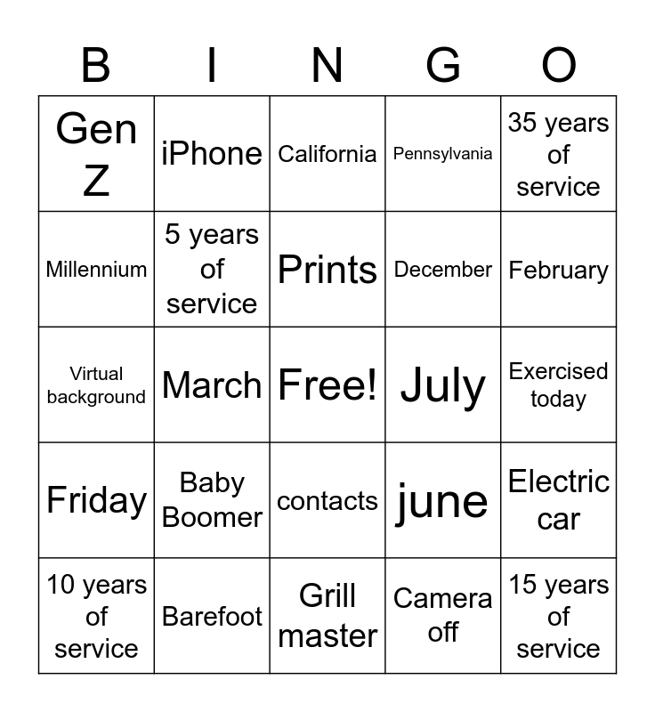 This bingo card has a free space and 88 words: Belt, Glasses, contacts, No socks, Socks, ring, Anklet, Bracelet, Traditional watch, Smart watch, No watch, Two monitors, Electric car, Exercised today, Earring, Prints, Wearing stripes, Wearing Flowers, Wearing paisley, Wearing plaid, Wearing tie-dye, No virtual background, Virtual background, Camera on, Camera off, In the building, Teleworking, headset on, On speaker, Atlanta, California, Pennsylvania, Military, Gen X, Baby Boomer, Millennium, Gen Z, Birth Month, January, February, March, April, may, june, July, August, September, October, November, December, Right handed, Left handed, Monday, Tuesday, Wednesday, Thursday, Friday, iPhone, Android, Fur baby, Twins, Grandchildren, Only child, Sneakers, Boots, Barefoot, 1 year of service, 5 years of service, 10 years of service, 15 years of service, 20 years of service, 25 years of service, 30 years of service, 35 years of service, Wearing a hat, Book Nerd, Window seat, Aisle sear, Grill master, Baker, EST, Central, Pacific Time, Hiring Branch 1, Hiring Branch, Drinking coffee/tea, water bottle and Wallet.